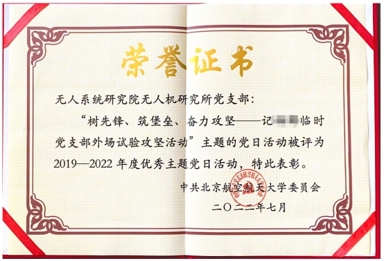 为庆祝中国共产党成立101周年,近日学校党委开展了优秀“主题党日”活动评选表彰工作,我院无人机研究所党支部报送的《树先锋 筑堡垒 奋力攻坚——记某临时党支部外场试验攻坚活动》获评北航2019-2022年度优秀“主题党日”活动。