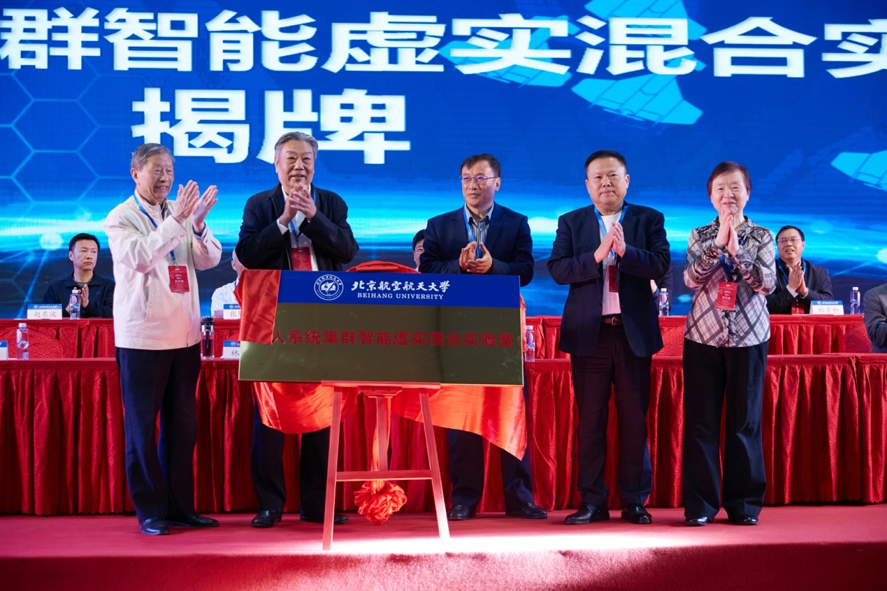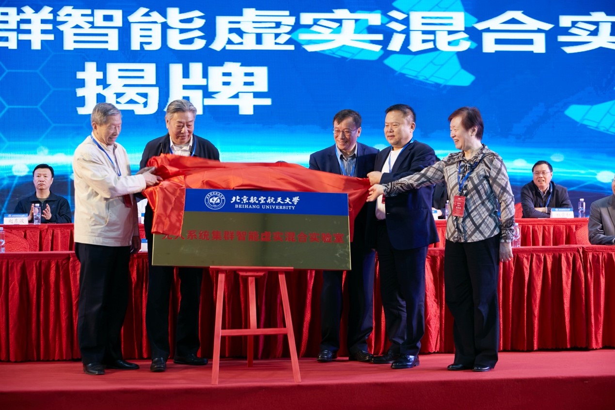 大会还邀请林左鸣理事长、陶智副校长、刘大响院士、孙聪院士、苏东林院士为北航“无人系统集群智能虚实混合实验室”揭牌,该实验室面积超过1200平方米,全域覆盖高精度运动捕捉系统,具备空地无人平台单机和集群在复杂任务场景下的虚实混合仿真功能,将支持无人蜂群的人工智能算法学习训练和验证评估取得更加显著的进步。