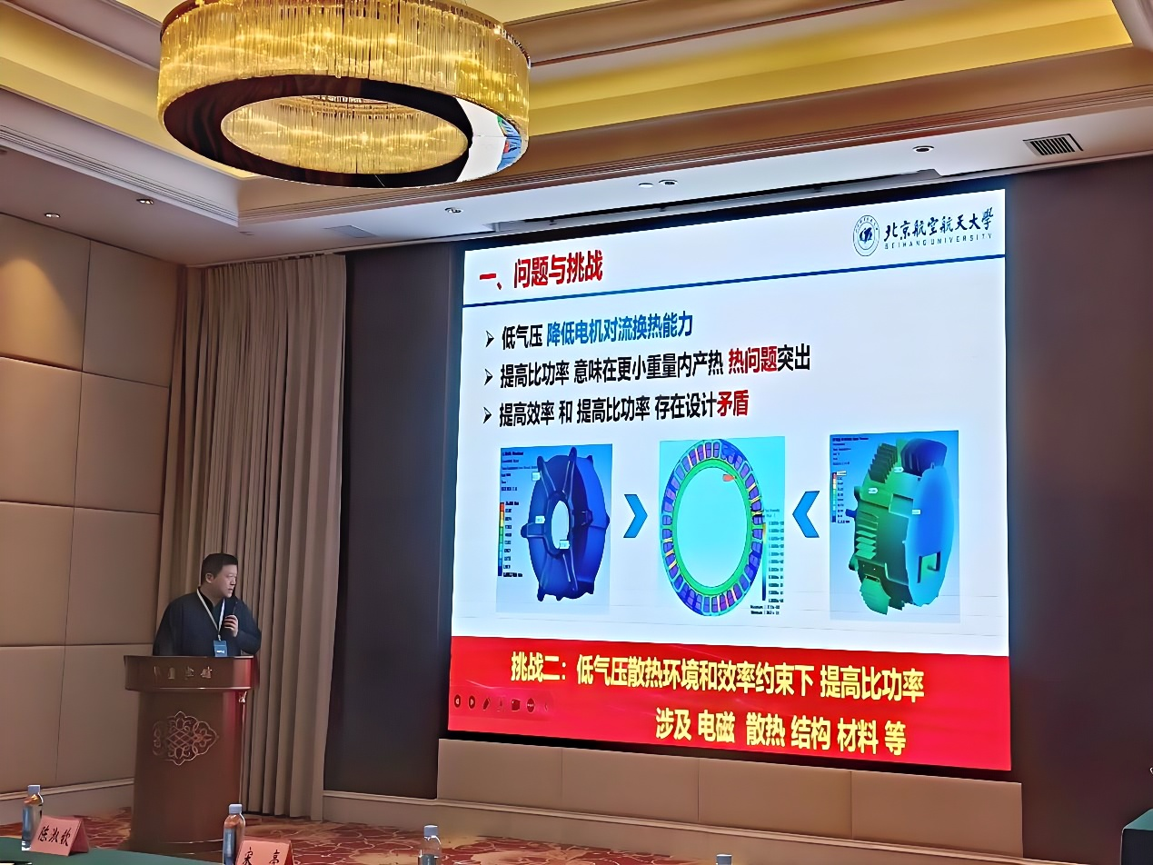 钱浩副教授在会上做《临空飞行器推进电机系统技术》报告。报告针对临空环境下电推进系统效率提升技术痛点,从结构减重、驱动器降损增效和创新板级热管理等方面,对团队工作进行了总结和介绍。该项目受某部临近空间引导基金支持,已顺利通过结题评审并荣获优等。
